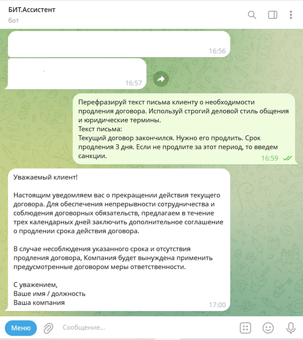 — Генерация шаблонов и ответов на стандартные запросы, индивидуальных писем и сообщений для клиентов. Всё в нужном тоне, быстро и точно.