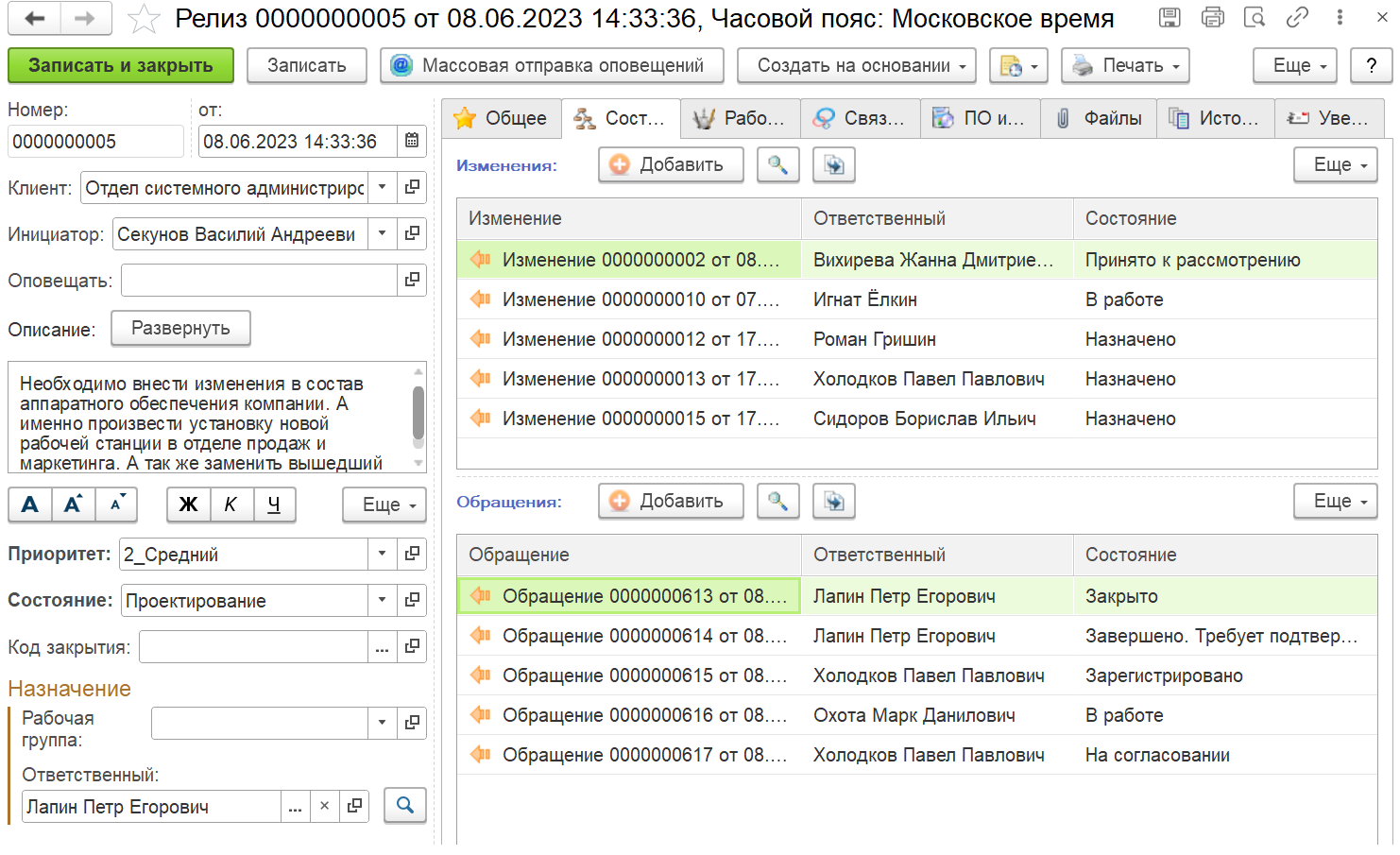 Конфигурация жизненного цикла обращений (инцидентов и запросов), включая статусы, сценарии, обработки и матрицы переходов