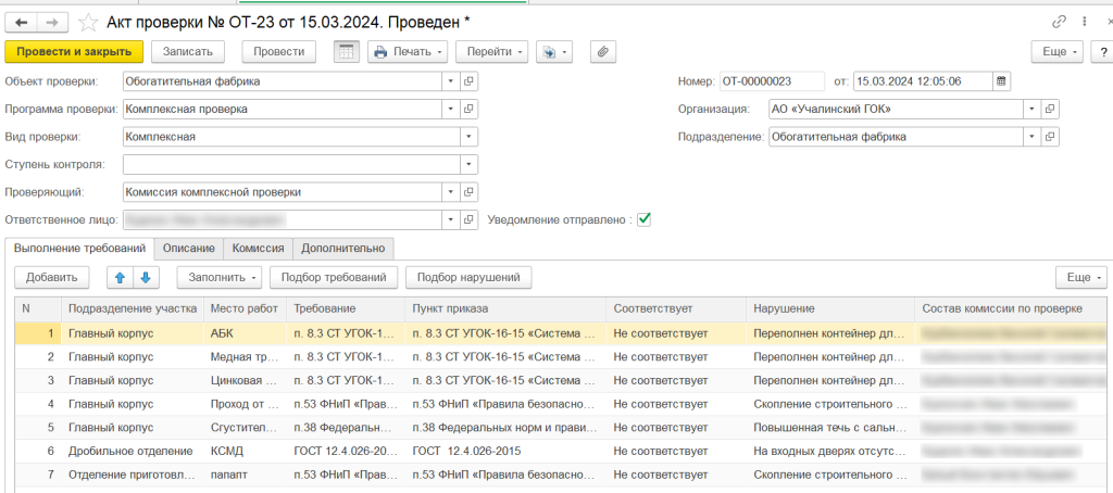 - проведение проверок с фиксацией выявленных нарушений, при котором есть возможность оценить и классифицировать типы риска нарушений, а также назначить ответственного за устранение нарушения сотрудника.
