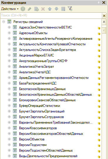 Список регистров сведений доступен в развернутом пункте «Регистры сведений» Конфигуратора.