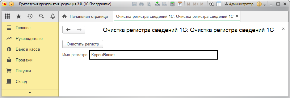 Выбираем наименование регистра для очистки (точное название можно узнать в конфигураторе), и активируем работу кнопкой «Очистить регистр».