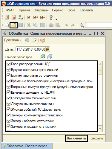 В итоге программа открылась как обычное приложение. Такая функция часто использовалась в более ранних версиях 1С. Изучаем вкладку «Открыть» и находим текущую обработку. Настроить ее очень просто - выбирайте дату и регистры для очистки. Затем подтверждаем запуск процесса очистки кнопкой «Выполнить».