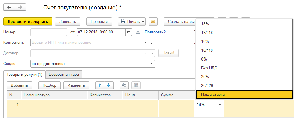 Требуется открыть программу и проверить, как отразилось изменение «Ввод нового значения перечисления ставки НДС». Открываем в документе «Счет» выбор значения ставок. В значении выбора возникло созданное нами значение «Наша ставка».
