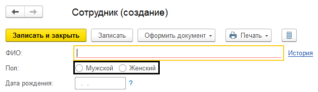Если ставки НДС в документе были представлены как открывающийся список, то в справочнике «Сотрудники», при вводе нового работника, нам будет предложено установить переключатель «Пол». Это тоже элемент перечисления, потому что мы выбираем из списка.