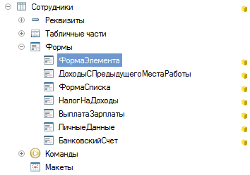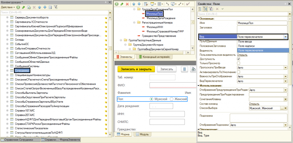 Чтобы посмотреть настройку их отображения, потребуется обратиться к тому элементу, где перечисление применяется. В нашем примере это справочник «Сотрудники». После его открытия, в дереве метаданных программы мы видим его настройки. Например, выбор пола - ФизлицоПол, и вид - «Поле переключателя». Поэтому в справочнике мы видим его в таком виде.
