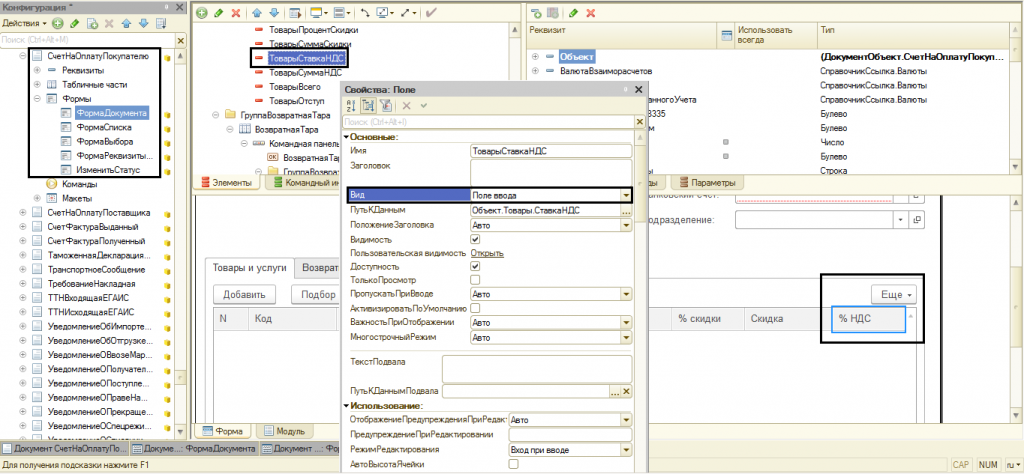 Проведем сравнение, как выполнен ввод значения перечисления, рассматриваемого в примере - НДС в документе «Счет на оплату покупателю». Для этого найдем данный элемент в дереве метаданных, но в списке документов, и посмотрим его форму.