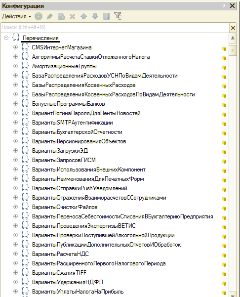 Разберёмся, как выглядит перечисление в конфигураторе программы 1С. После того, как мы откроем конфигурацию, в дереве метаданных мы увидим блок «Перечисления».