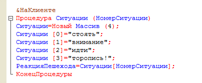 - «Команда «Стой» – мы задаем номер ситуации и запускаем процедуру получения данных из массива НомерСитуации=0;Ситуации(НомерСитуации);