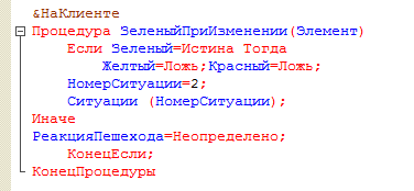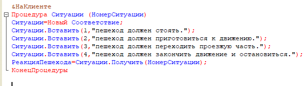 - Логическое выражение не может закончился без команды Иначе, поскольку процедура должна выполнить какое-либо действие и в том случае, когда условия не выполнены. Иначе РеакцияПешехода=Неопределено; КонецЕсли; КонецПроцедуры.