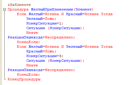 Следующий обработчик будет состоять из 2-х частей: когда с желтым работает красный, и когда с желтым работает зеленый. Создаем обработчик ПриИзменении реквизита Желтый. Код будем писать аналогично, за тем исключением, что внутри обработчика мы опишем процедуру Если 2 раза.